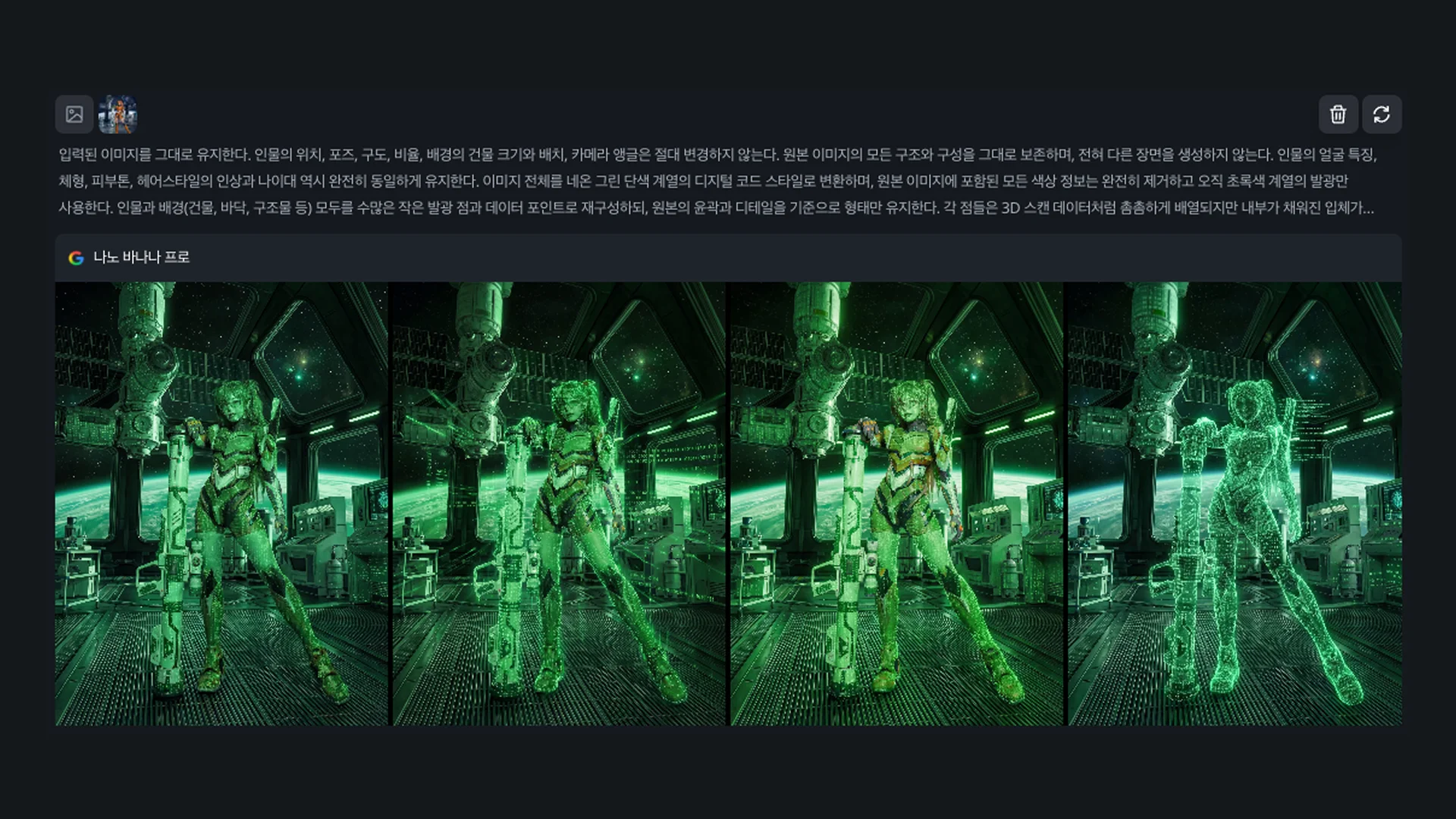 입력된 이미지를 그대로 유지한다. 인물의 위치, 포즈, 구도, 비율, 배경의 건물 크기와 배치, 카메라 앵글은 절대 변경하지 않는다. 원본 이미지의 모든 구조와 구성을 그대로 보존하며, 전혀 다른 장면을 생성하지 않는다. 인물의 얼굴 특징, 체형, 피부톤, 헤어스타일의 인상과 나이대 역시 완전히 동일하게 유지한다. 이미지 전체를 네온 그린 단색 계열의 디지털 코드 스타일로 변환하며, 원본 이미지에 포함된 모든 색상 정보는 완전히 제거하고 오직 초록색 계열의 발광만 사용한다. 인물과 배경(건물, 바닥, 구조물 등) 모두를 수많은 작은 발광 점과 데이터 포인트로 재구성하되, 원본의 윤곽과 디테일을 기준으로 형태만 유지한다. 각 점들은 3D 스캔 데이터처럼 촘촘하게 배열되지만 내부가 채워진 입체가 아니라 얇은 표면 레이어처럼 구성된다. 바이너리 숫자와 디지털 코드 텍스처는 표면을 따라 흐르듯 얹히며, 과하게 강조되지 않고 자연스럽게 녹아든다. 얼굴의 구체적인 이목구비는 또렷하게 드러나지 않아도 되며, 전체 실루엣과 비율 중심으로 인물이 인식되도록 한다. 조명은 네온 그린 발광 기반으로만 구성되며 다른 색의 빛은 절대 포함되지 않는다. 글로우와 빛 번짐은 부드럽게 제한적으로 적용되어 강한 외곽선이나 과도한 대비가 생기지 않도록 한다. 하이라이트는 은은하게 퍼지고, 어두운 영역에서도 미세한 입자들이 약하게 빛나며 깊이감을 만든다. 볼류메트릭 글로우와 미세한 안개는 최소한으로 적용하여 전체가 가볍고 비물질적인 데이터 레이어처럼 보이도록 한다. 실사 기반 디테일을 유지하면서도 초현실적인 디지털 코드 변환 표현. |
