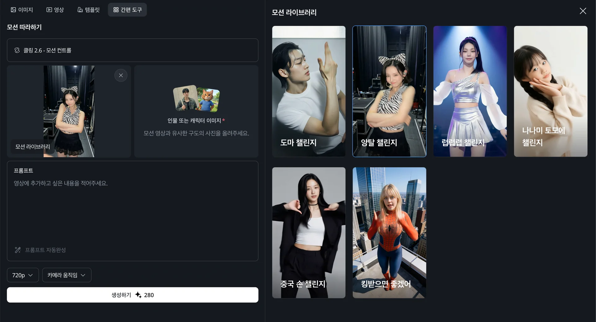 모션 컨트롤 기능은 드롭샷 AI에서 바로 사용해볼 수 있어요. 따라하고 싶은 영상을 직접 첨부하거나, ‘모션 라이브러리’에서 틱톡, 인스타그램, 유튜브 등 SNS에서 핫한 챌린지 영상을 바로 선택할 수도 있어요. 영상에 입히고 싶은 이미지까지 골라 생성하면 끝입니다. 쉽고 간편하게 유행하는 AI 릴스 콘텐츠를 만들 수 있죠.