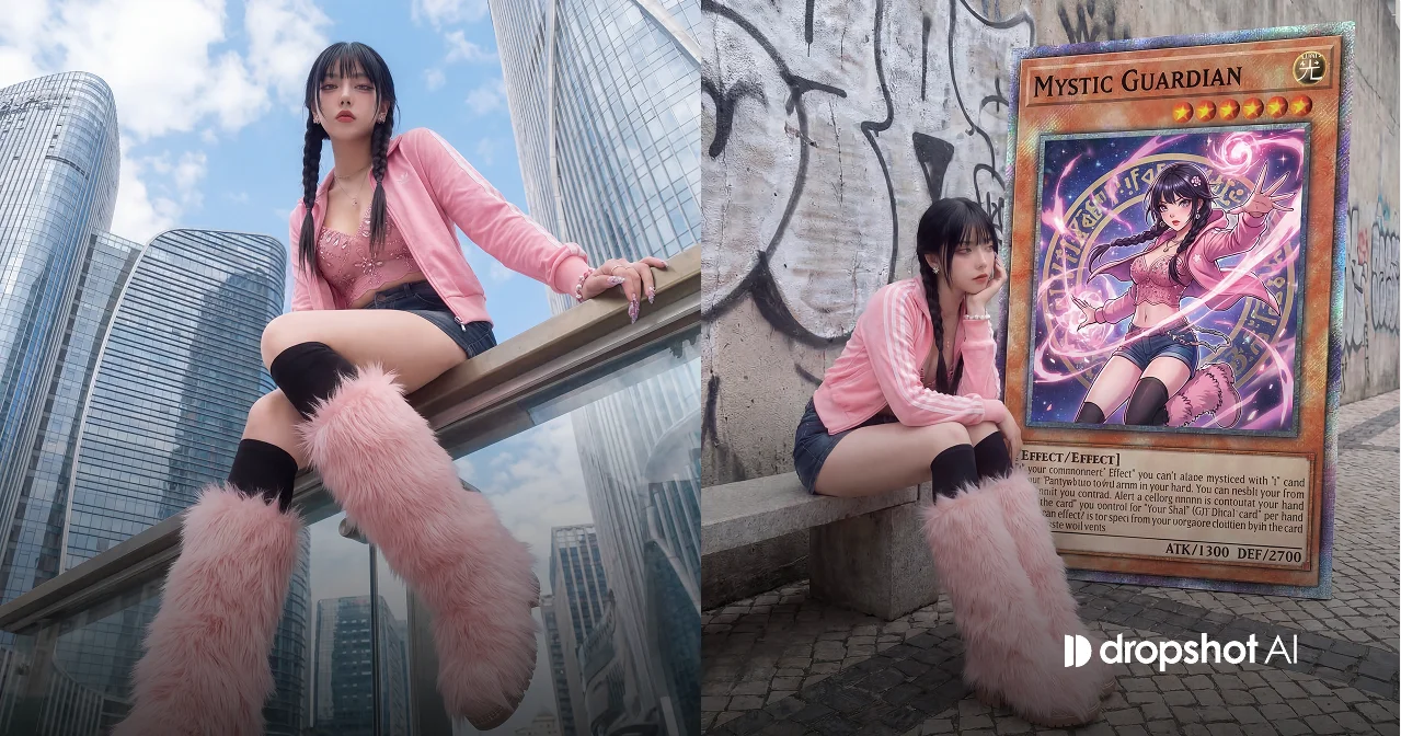 입력 이미지를 인물의 기본 정체성으로 사용한다. 얼굴 구조, 비율, 피부 톤, 헤어스타일의 인상, 나이대를 그대로 유지하며 다른 사람으로 바꾸지 않는다. 복장, 액세서리, 전체적인 스타일과 자세도 가능한 한 동일하게 유지한다. 장면은 도심의 거친 콘크리트 벽 앞 낮은 벤치에 앉아 있는 모습이며 인물은 한 손으로 몸을 지탱하며 옆을 바라보는 자연스러운 포즈를 취하고 있다. 바닥은 패턴이 있는 보도블록이며 주변 환경은 현실적인 도시 거리 느낌을 유지한다. 사진은 자연스러운 스트리트 패션 스냅처럼 보이며 과장된 연출이 아닌 현실적인 순간처럼 보인다. 인물 옆에는 실제 사람 키에 가까운 거대한 유희왕 카드가 세워져 있다. 카드의 디자인은 실제 Yu-Gi-Oh! 카드 레이아웃을 기반으로 하며 상단에는 카드 이름과 별 등급, 속성 아이콘이 있고 중앙에는 카드 일러스트 영역이 있다. 그 일러스트 영역에는 동일한 인물이 유희왕 애니메이션 스타일의 캐릭터로 그려져 있으며 역동적인 포즈와 화려한 에너지 효과가 있는 판타지 전투 장면처럼 표현된다. 카드 하단에는 효과 텍스트 박스와 공격력/수비력 숫자 영역이 존재하며 전체 카드 프레임은 반짝이는 홀로그램 느낌의 카드 질감을 가진다. 전체 이미지는 현실 사진과 거대한 카드 오브제가 함께 있는 초현실적인 장면처럼 보인다. 카메라는 약간 낮은 시점에서 촬영된 스트리트 패션 사진 느낌이며 자연광 아래 선명한 디테일을 가진다. 인물은 현실적인 사진 스타일로 유지되며 카드 안의 캐릭터만 일본 애니메이션 기반의 유희왕 그림체로 표현된다. 포토리얼리즘 사진, 실제 거리 환경, 선명한 디테일, 고해상도, 하나의 연속된 프레임, 콜라주나 분할 화면 없이 하나의 장면. |