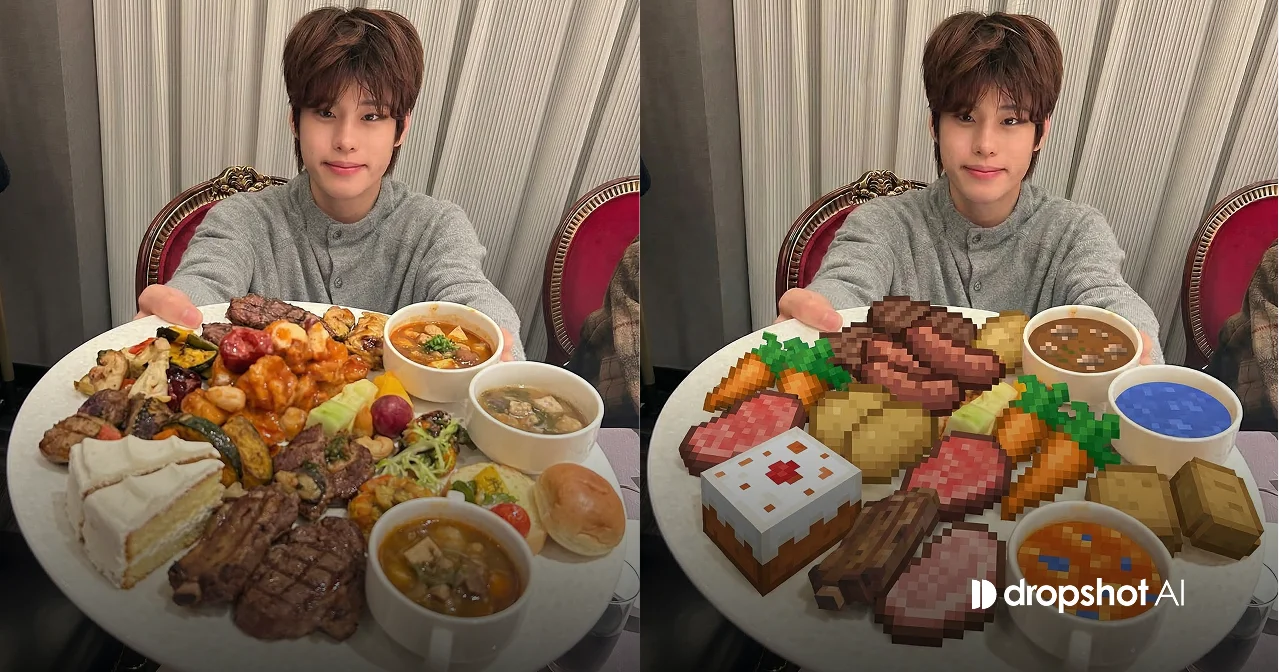 입력 이미지를 장면의 기본 구조로 사용한다. 테이블의 구조, 냄비 위치, 그릇 배치, 식당 환경, 조명, 카메라 구도는 그대로 유지한다. 사진 속에 보이는 인물의 얼굴, 피부, 손, 팔, 몸, 의상은 절대 변경하지 않는다. 인물은 현실적인 사진 그대로 유지하며 픽셀 스타일로 바꾸지 않는다. 사진 속에 보이는 모든 음식만 Minecraft 스타일의 음식으로 변환한다. 음식들은 전부 마인크래프트 게임에서 나오는 것처럼 큼직한 픽셀 블록 질감으로 표현한다. 모든 고기는 반드시 마인크래프트 고기 아이템으로 바꾼다: 소고기, 돼지고기, 양고기 큐브 형태의 픽셀 고기. 접시에 있는 야채나 샐러드, 초록색 재료는 모두 마인크래프트 당근이나 빵 아이템으로 변경한다. 테이블 위에 있는 모든 음식 재료는 현실 음식이 아닌 Minecraft 음식 아이템으로 보이도록 만든다. 냄비 속 국물 요리는 마인크래프트 액체 스타일로 바꾼다. 냄비 안의 국물은 픽셀 형태의 스프, 물, 혹은 용암으로 표현한다. 액체는 마인크래프트 게임에서 볼 수 있는 단순한 블록 스타일 텍스처로 표현되며, 물은 파란 픽셀 패턴, 용암은 밝은 주황색 픽셀 패턴, 스프는 갈색 또는 주황색 픽셀 패턴으로 나타난다. 전체 장면은 현실적인 식당 사진이지만 음식만 마인크래프트 게임 아이템처럼 보이는 초현실적인 조합으로 표현한다. |