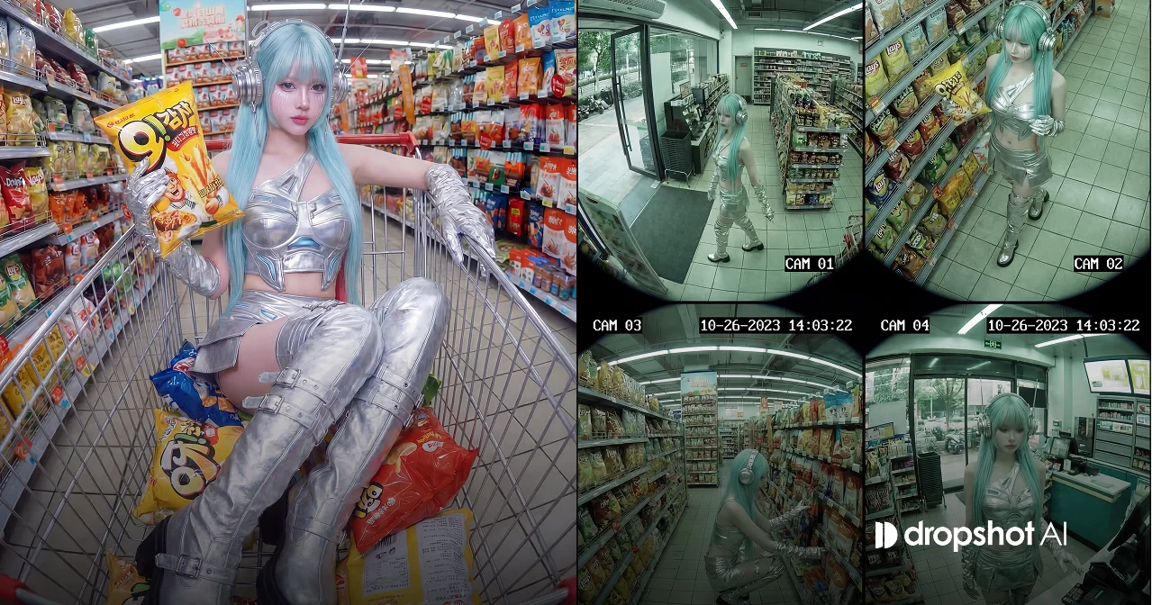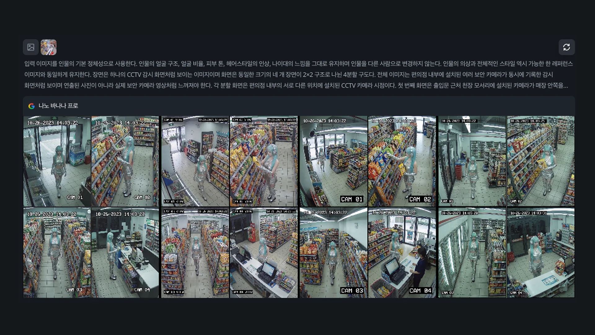 입력 이미지를 인물의 기본 정체성으로 사용한다. 인물의 얼굴 구조, 얼굴 비율, 피부 톤, 헤어스타일의 인상, 나이대의 느낌을 그대로 유지하며 인물을 다른 사람으로 변경하지 않는다. 인물의 의상과 전체적인 스타일 역시 가능한 한 레퍼런스 이미지와 동일하게 유지한다. 장면은 하나의 CCTV 감시 화면처럼 보이는 이미지이며 화면은 동일한 크기의 네 개 장면이 2×2 구조로 나뉜 4분할 구도다. 전체 이미지는 편의점 내부에 설치된 여러 보안 카메라가 동시에 기록한 감시 화면처럼 보이며 연출된 사진이 아니라 실제 보안 카메라 영상처럼 느껴져야 한다. 각 분할 화면은 편의점 내부의 서로 다른 위치에 설치된 CCTV 카메라 시점이다. 첫 번째 화면은 출입문 근처 천장 모서리에 설치된 카메라가 매장 안쪽을 내려다보는 장면이다. 두 번째 화면은 과자 진열대 앞에서 인물이 과자를 고르며 서 있는 장면이다. 세 번째 화면은 편의점 통로를 걸어가는 장면이다. 네 번째 화면은 계산대 근처에서 서 있는 장면이다. 모든 카메라는 천장 모서리에서 약간 아래를 향해 내려다보는 시점이며 보안 카메라 특유의 어색한 구도와 약간의 광각 렌즈 왜곡이 있다. 편의점 내부에는 과자 진열대, 음료 냉장고, 계산대, 형광등 조명, 타일 바닥 등이 보이며 인물은 네 장면에서 자연스럽게 이동하다가 포착된 것처럼 표현된다. 각 분할 화면 하단에는 픽셀 형태의 CCTV 도트 글자로 카메라 번호가 표시된다. 첫 번째 화면에는 CAM 01, 두 번째 화면에는 CAM 02, 세 번째 화면에는 CAM 03, 네 번째 화면에는 CAM 04가 표시된다. 각 화면 상단에는 흰색 도트 디지털 글자로 날짜와 시각이 표시된다. 예시 형식은 10-26-2023 14:03:22와 같은 보안 카메라 타임스탬프 형식이다. 영상은 약간 낮은 해상도를 가지며 색감은 평평하고 약간 녹색 기운이 돌며 디지털 노이즈와 압축 흔적이 보인다. 전체 이미지는 하나의 CCTV 모니터 화면처럼 보이는 4분할 감시 화면이며 추가적인 작은 화면이나 화면 속 화면 형태의 PIP 이미지는 포함하지 않는다. 실제 감시 카메라 영상처럼 사실적인 사진 스타일이며 일러스트 스타일이나 그래픽 스타일이 아닌 현실적인 감시 카메라 이미지로 표현한다. |