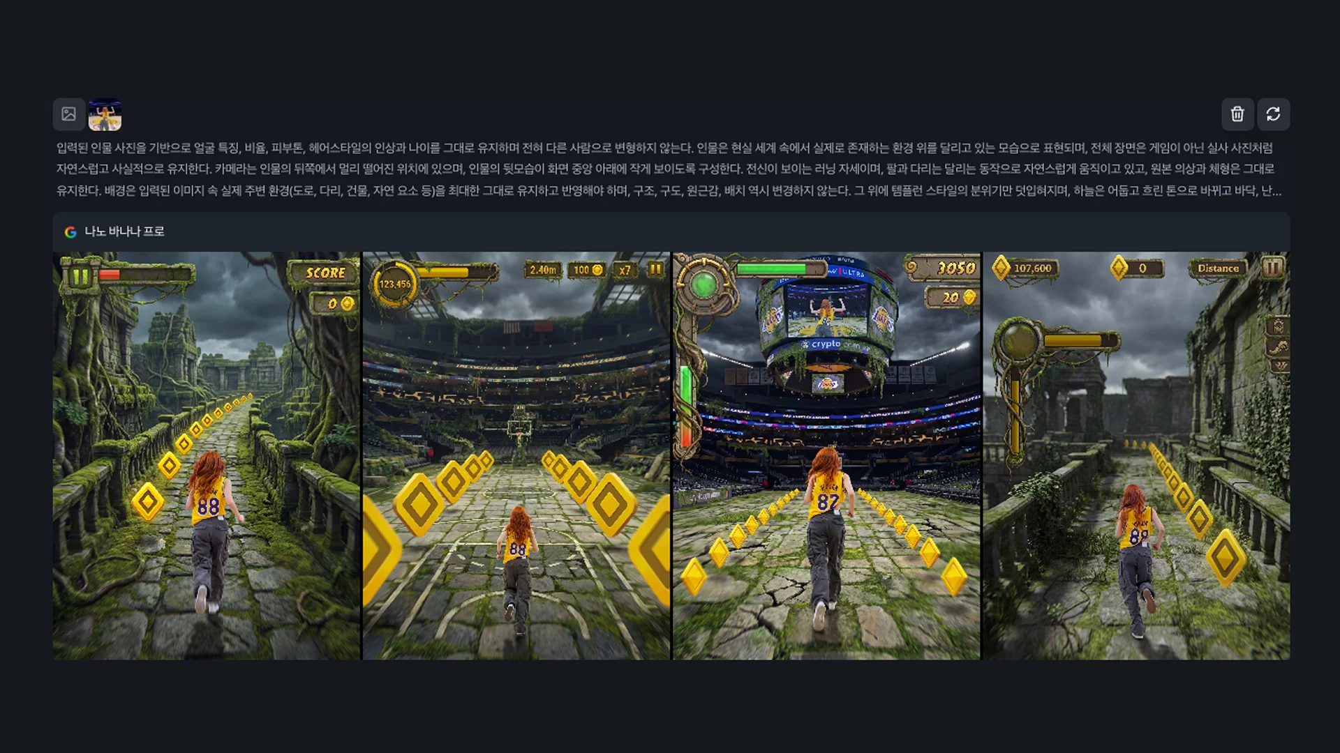 입력된 인물 사진을 기반으로 얼굴 특징, 비율, 피부톤, 헤어스타일의 인상과 나이를 그대로 유지하며 전혀 다른 사람으로 변형하지 않는다. 인물은 현실 세계 속에서 실제로 존재하는 환경 위를 달리고 있는 모습으로 표현되며, 전체 장면은 게임이 아닌 실사 사진처럼 자연스럽고 사실적으로 유지한다. 카메라는 인물의 뒤쪽에서 멀리 떨어진 위치에 있으며, 인물의 뒷모습이 화면 중앙 아래에 작게 보이도록 구성한다. 전신이 보이는 러닝 자세이며, 팔과 다리는 달리는 동작으로 자연스럽게 움직이고 있고, 원본 의상과 체형은 그대로 유지한다. 배경은 입력된 이미지 속 실제 주변 환경(도로, 다리, 건물, 자연 요소 등)을 최대한 그대로 유지하고 반영해야 하며, 구조, 구도, 원근감, 배치 역시 변경하지 않는다. 그 위에 템플런 스타일의 분위기만 덧입혀지며, 하늘은 어둡고 흐린 톤으로 바뀌고 바닥, 난간, 건물 표면에는 이끼와 풀이 자연스럽게 자라나 오래된 유적처럼 보이도록 한다. 화면 중앙에는 노란 다이아몬드 형태의 코인이 길을 따라 일정한 간격으로 이어지며 원근감 있게 작아지고, 코인의 안쪽 홈 부분은 더 어두운 노란색으로 표현된다. 좌측 UI는 상단의 원형 구조물과 아래의 체력바가 하나로 자연스럽게 이어진 형태이며, 어두운 노란색 계열로 표현되고 표면에는 이끼, 덩굴, 나무 뿌리 같은 디테일이 추가되어 자연에 잠식된 느낌을 준다. 상단 UI(점수, 코인, 거리 등)와 좌우 장식 UI 역시 템플런 스타일을 유지하되 현실 장면 위에 자연스럽게 합성된 느낌이어야 한다. 괴물은 장면에서 완전히 제거되어야 하며, 화면 중앙 하단의 아이템 버튼도 존재하지 않는다. 전체 이미지에는 약한 모션 블러와 얕은 심도가 적용되어 달리는 속도감이 느껴지고, 자연광 기반 조명 위에 코인과 UI 요소만 은은하게 발광한다. 최종 결과는 입력 이미지의 현실 배경을 그대로 유지하면서 템플런 UI와 분위기만 결합된 하이브리드 장면으로, 포토리얼리즘을 유지하며 게임 감성이 자연스럽게 스며든 느낌이어야 한다. |