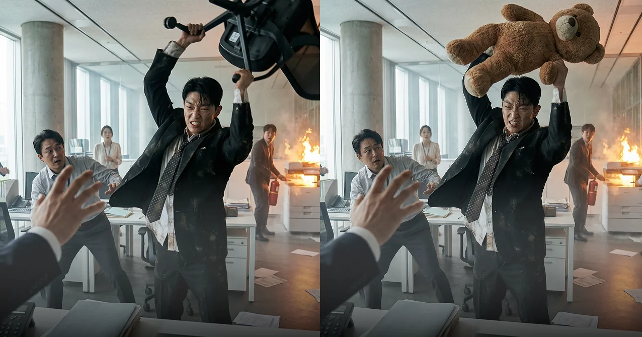 GPT Image 1.5는 이미 만들어진 이미지에서 일부만 고치거나, 디테일을 살짝 다듬는 작업을 이전보다 훨씬 정확하게 할 수 있게 됐어요. 아래는 남성이 들고있는 의자를 ‘곰돌이 인형’으로 바꾸어 달라고 요청한 것인데요. 나머지 요소의 흐트러짐 없이 원하는 부분만 잘 편집이 된 모습이죠.