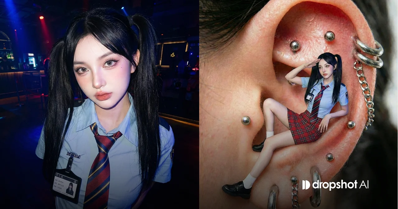 입력 이미지를 피사체의 기본 정체성으로 사용한다. 귀의 형태, 피부 질감, 모공, 붉은기, 자연스러운 광택, 귓바퀴 구조와 전체 비율을 그대로 유지한다. 인물 레퍼런스 사진을 함께 사용할 경우, 인물의 이목구비, 얼굴 비율, 피부 톤, 헤어스타일, 복장, 신발, 액세서리, 나이를 완전히 동일하게 유지하며 다른 사람으로 변경하지 않는다. 초현실적인 스케일 대비 순간을 시네마틱한 매크로 필름 사진처럼 재현한다. 화면을 가득 채우는 거대한 귀를 초근접 매크로 촬영처럼 극도로 사실적으로 표현한다. 피사체는 5~6개의 화려한 은색 피어싱으로 장식된 기념비적으로 확대된 인간의 귀이다. 두꺼운 링, 체인 형태의 피어싱, 바벨, 스터드 등 다양한 은색 금속 장식이 귓바퀴와 귓볼, 안쪽 연골을 따라 배치되어 있으며 금속 특유의 반사광과 질감이 선명하게 드러난다. 인물은 귀 구멍에 정확히 맞물릴 정도로 크게 설정하여 내부 공간이 거의 보이지 않을 정도로 귀를 가득 채운다. 인물은 여유로운 자세로 귓구멍 가장자리에 걸쳐 앉아 있으며 엉덩이는 안쪽에 두고 두 다리는 바깥쪽으로 자연스럽게 뻗어 귀 외부로 내려온 상태다. 등과 허리는 귀의 곡면에 기대어 있고 전체적인 분위기는 편안하면서도 자신감 있는 느낌이다. 복장과 얼굴, 헤어스타일, 모든 디테일은 레퍼런스 이미지와 완전히 동일하게 유지한다. 조명은 강하고 깨끗한 흰색 조명으로 귀와 인물을 동시에 비추어 선명하고 밝으며 약간의 광택이 느껴지도록 한다. 피부에는 또렷한 하이라이트가 형성되고 피어싱에는 선명한 금속 반사가 나타난다. 카메라는 극단적인 매크로 클로즈업 구도이며 원근 왜곡이 강하게 느껴지도록 설정한다. 얕은 심도로 배경은 강하게 흐려지고 귀와 인물이 또렷한 초점의 중심이 된다. 35밀리미터 필름 질감으로 촬영한 느낌을 살리며 은은한 필름 그레인, 부드러운 하이라이트 번짐, 약간 완벽하지 않은 초점을 유지하고 디지털처럼 지나치게 선명한 느낌은 배제한다. 완전한 실사 표현이며 일러스트, 애니메이션, 삼차원 렌더링 느낌은 허용하지 않는다. 하나의 연속된 프레임으로만 구성하고 분할 화면이나 콜라주는 사용하지 않는다. |