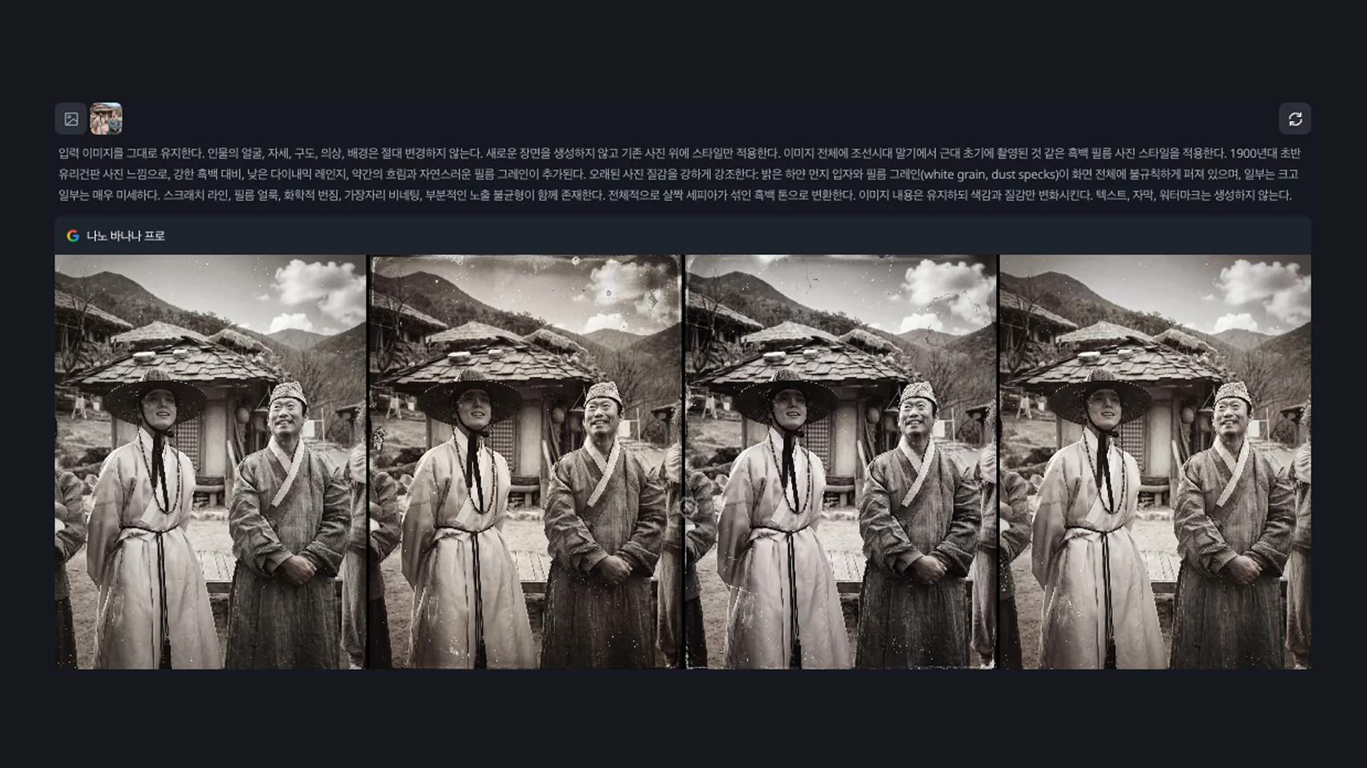 입력 이미지를 그대로 유지한다. 인물의 얼굴, 자세, 구도, 의상, 배경은 절대 변경하지 않는다. 새로운 장면을 생성하지 않고 기존 사진 위에 스타일만 적용한다. 이미지 전체에 조선시대 말기에서 근대 초기에 촬영된 것 같은 흑백 필름 사진 스타일을 적용한다. 1900년대 초반 유리건판 사진 느낌으로, 강한 흑백 대비, 낮은 다이내믹 레인지, 약간의 흐림과 자연스러운 필름 그레인이 추가된다. 빛바랜 사진 느낌의 노란 느낌이 가미되어 있다. 오래된 사진 질감을 강하게 강조한다: 밝은 하얀 먼지 입자와 필름 그레인(white grain, dust specks)이 화면 전체에 불규칙하게 퍼져 있으며, 일부는 크고 일부는 매우 미세하다. 스크래치 라인, 필름 얼룩, 화학적 번짐, 가장자리 비네팅, 부분적인 노출 불균형이 함께 존재한다. 전체적으로 살짝 세피아가 섞인 흑백 톤으로 변환한다. 이미지 내용은 유지하되 색감과 질감만 변화시킨다. 텍스트, 자막, 워터마크는 생성하지 않는다. |