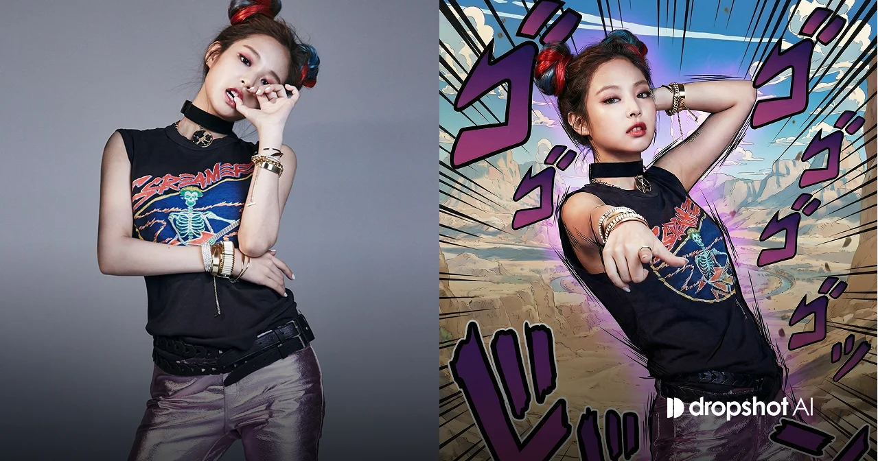 입력 이미지를 인물의 기본 정체성으로 사용한다. 얼굴의 이목구비, 얼굴 비율, 피부 톤, 체형, 헤어스타일, 의상 디테일을 그대로 유지하며 인물을 다른 사람으로 바꾸지 않는다. 인물은 반드시 실사(포토리얼) 상태를 유지해야 하며 일러스트화, 만화풍 변형, 애니 스타일 변환은 허용되지 않는다. 인물의 피부 질감, 조명 반응, 디테일은 실제 사진과 동일한 현실감을 유지한다. 인물의 포즈만 역동적으로 변경한다. 카메라를 향해 손가락질을 하거나 손을 뻗어 관객을 압도하는 제스처, 몸을 비틀며 앞으로 치고 나오는 듯한 공격적인 포즈를 취한다. 정지된 포즈가 아니라 긴장감이 극대화된 ‘결정적 순간’을 포착한 동작이며 전체 연출은 『죠죠의 기묘한 모험』 특유의 감성을 따른다. 과장된 원근감과 강한 자세 대비, 몸의 축이 비틀린 듯한 비현실적인 포즈 구도를 강조한다. 배경에는 죠죠 스타일의 연출 효과를 추가한다. 방사형 강조선(스피드 라인), 강한 대비의 명암 스트로크, 공기를 찢는 듯한 에너지 흐름 표현이 들어가며 일본 만화풍 효과음 텍스트 「ゴゴゴゴ」「ドドド」「ズキューン」 등을 보라색 또는 검정 계열로 인물을 둘러싸듯 배치해 긴장감을 증폭시킨다. 효과음과 강조선은 만화 스타일로 표현하되 인물 자체에는 절대 드로잉 필터를 적용하지 않으며 인물의 실사 질감은 그대로 유지한다. 조명은 드라마틱하게 대비가 강하고 얼굴과 손 제스처가 가장 강하게 강조되며 단일 프레임 이미지로 구성하고 콜라주, 분할 컷, 만화 패널 구성은 사용하지 않는다. |