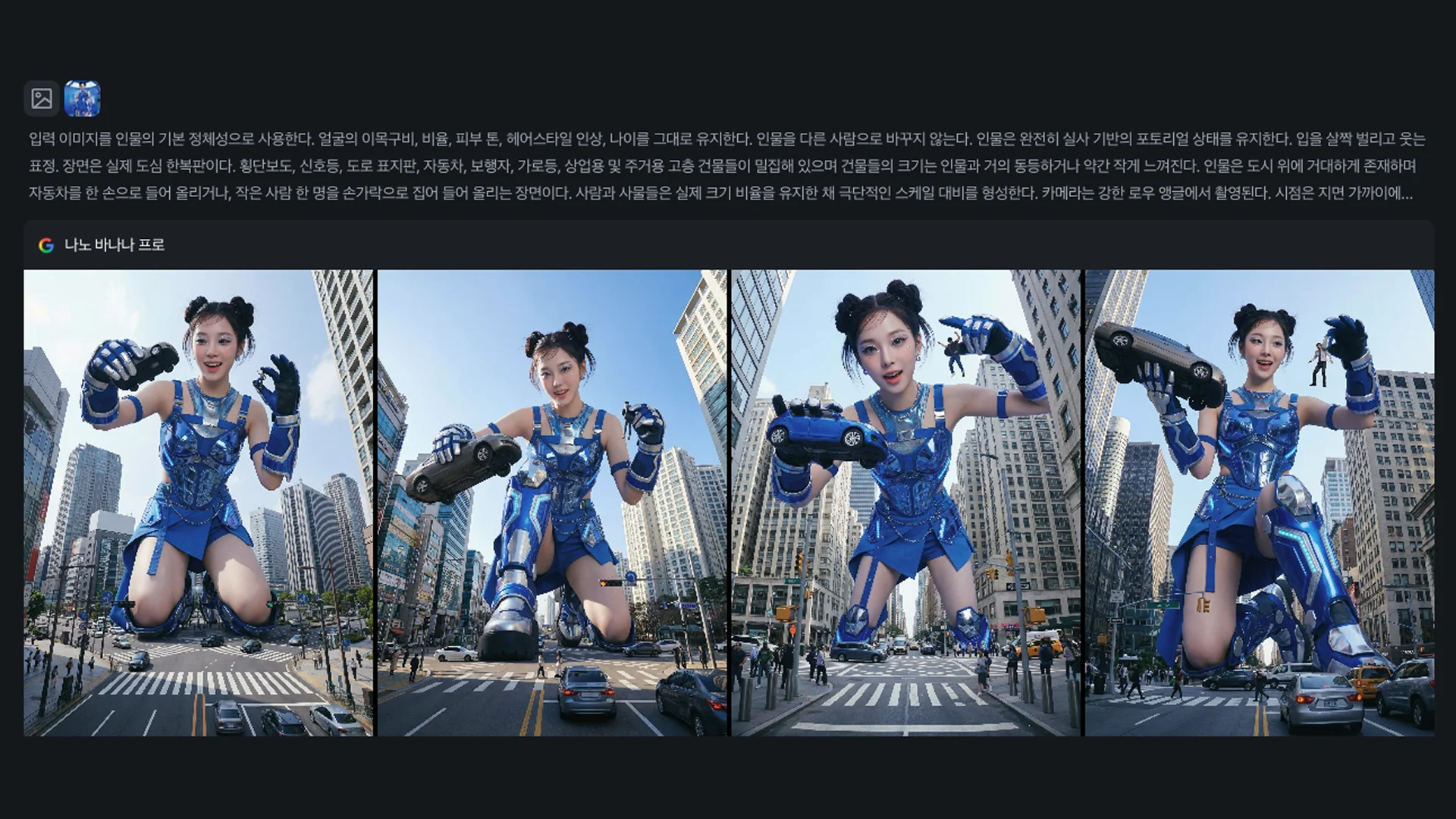입력 이미지를 인물의 기본 정체성으로 사용한다. 얼굴의 이목구비, 비율, 피부 톤, 헤어스타일 인상, 나이를 그대로 유지한다. 인물을 다른 사람으로 바꾸지 않는다. 인물은 완전히 실사 기반의 포토리얼 상태를 유지한다. 입을 살짝 벌리고 웃는 표정. 장면은 실제 도심 한복판이다. 횡단보도, 신호등, 도로 표지판, 자동차, 보행자, 가로등, 상업용 및 주거용 고층 건물들이 밀집해 있으며 건물들의 크기는 인물과 거의 동등하거나 약간 작게 느껴진다. 인물은 도시 위에 거대하게 존재하며 자동차를 한 손으로 들어 올리거나, 작은 사람 한 명을 손가락으로 집어 들어 올리는 장면이다. 사람과 사물들은 실제 크기 비율을 유지한 채 극단적인 스케일 대비를 형성한다. 카메라는 강한 로우 앵글에서 촬영된다. 시점은 지면 가까이에 위치하며 위를 올려다보는 구도로 인물의 다리나 신체 일부가 프레임을 가로지른다. 광각 렌즈로 인한 원근 왜곡이 강조되고, 인물의 신체는 과장되게 커 보인다. 자연광 기반의 낮 장면 또는 맑은 하늘 아래의 도시 조명 환경이며, 합성 느낌 없이 현실적인 그림자와 반사광을 유지한다. 포토리얼, 현실적인 합성, 초현실적이지만 실제 사진처럼 보이도록 한다. |